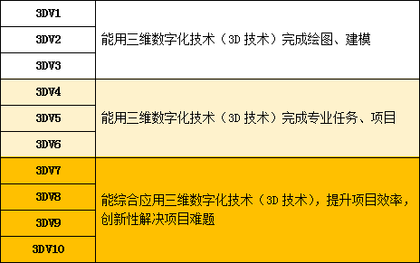 与此同时,源自于全国3D大赛的三维数字化技术(3D技术)能力评定标准,通过“四促”宗旨的传播和影响,在全国部分高校、企业、用人单位中得到了宣传贯彻和试点推行,反响积极、反映良好,具有八年扎实的实践基础。在以上的共识和试点基础上,三维数字化技术应用能力测评与认证方案经过总结、完善和提升,形成了一套评价体系和评价标准: